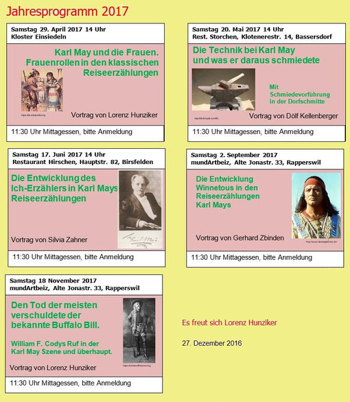 "Im Vortrag spreche ich über die Freuden und Leiden in Karl Mays Leben. Eine Biographie weder brandschwarz noch rosenrot." (Lorenz Hunziker).